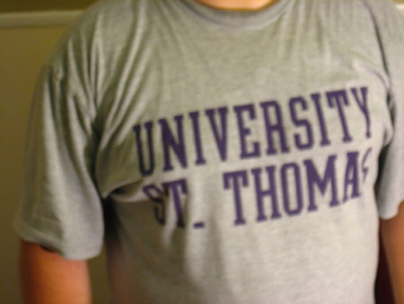 Yes, this shirt was purchased at my alma mater, the University of St. Thomas. Shortly before graduating, I received a gift certificate from my work-study employer for the UST Bookstore, so I figured I should by some UST merch (besides my uber-cool, limited-edition UST hat). Therefore, I purchased a couple T-shirts that just say "University St. Thomas" in big letter on the front. I usually wear these on pretty boring, low-key days because I'm not that huge of a fan of my alma mater, although I made the best of it.