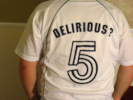 OK, so I'm already breaking one of my rules for the T-shirt blog posts. I'm not currently wearing this shirt. But, this is one of my more rarely worn shirts, the delirious? jersey: