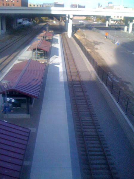 I don't really know what's inside, but I am assuming that down the escalator inside is access to the Northstar Rail Target Field station, which opens in less than a month and allows commuters and game goers to take a full-size passenger change all the way from Big Lake, Elk River, and other northwest suburbs. I was able to cross the platform and the neighboring street and see the northeast end of the Northstar platform, pictured here: