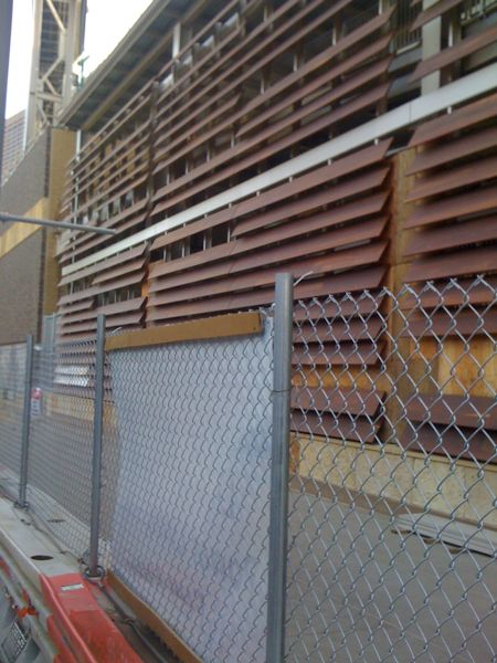 The stadium building is still under construction so most of it was blocked off, but there were a couple interesting parts visible on this, the northeast side of the building. First, in the middle of the northeast wall there's some windows with a really odd wooden paneling over them. It seems like an eyesore to me, although my guess is that the street-level windows are just boarded up until the construction is finished.